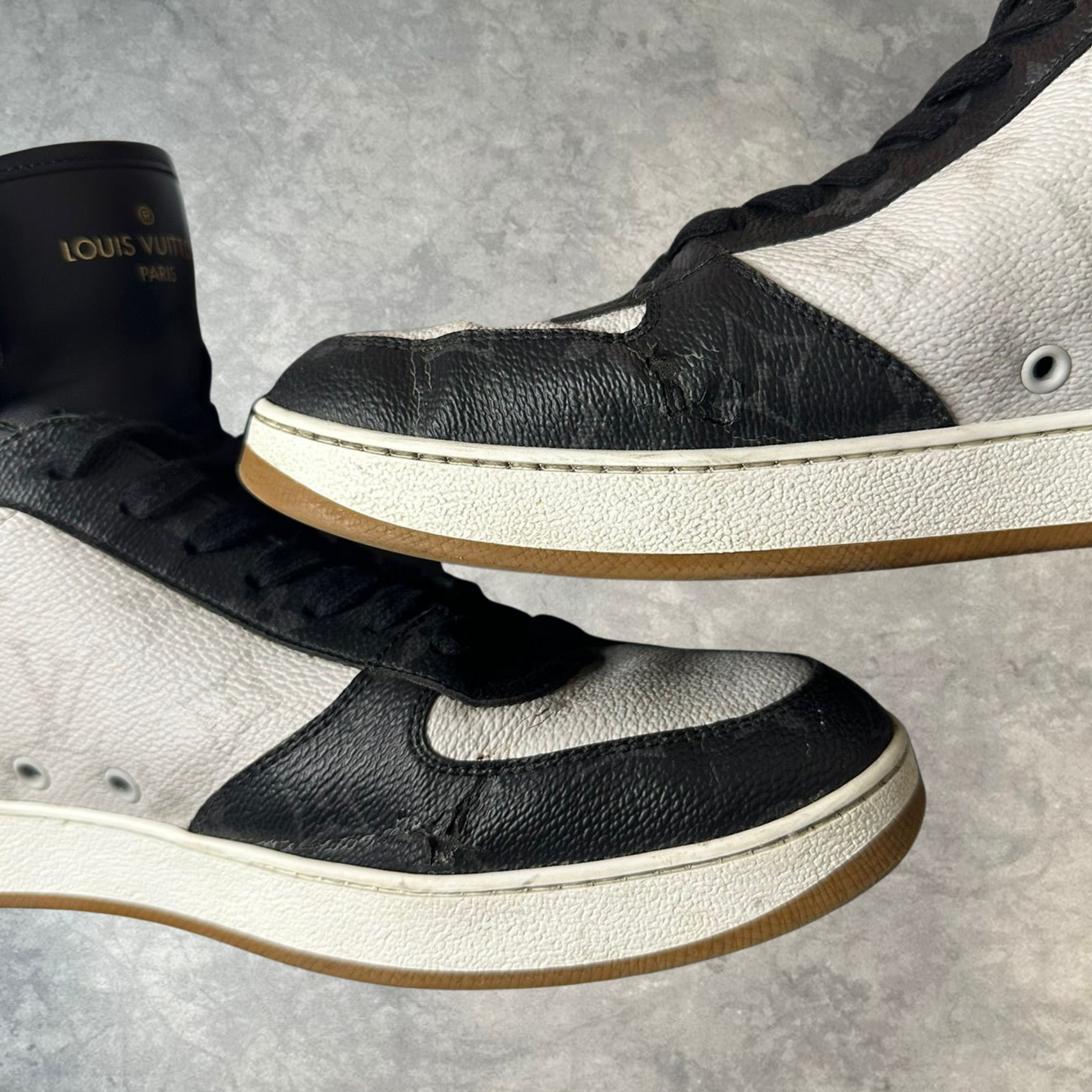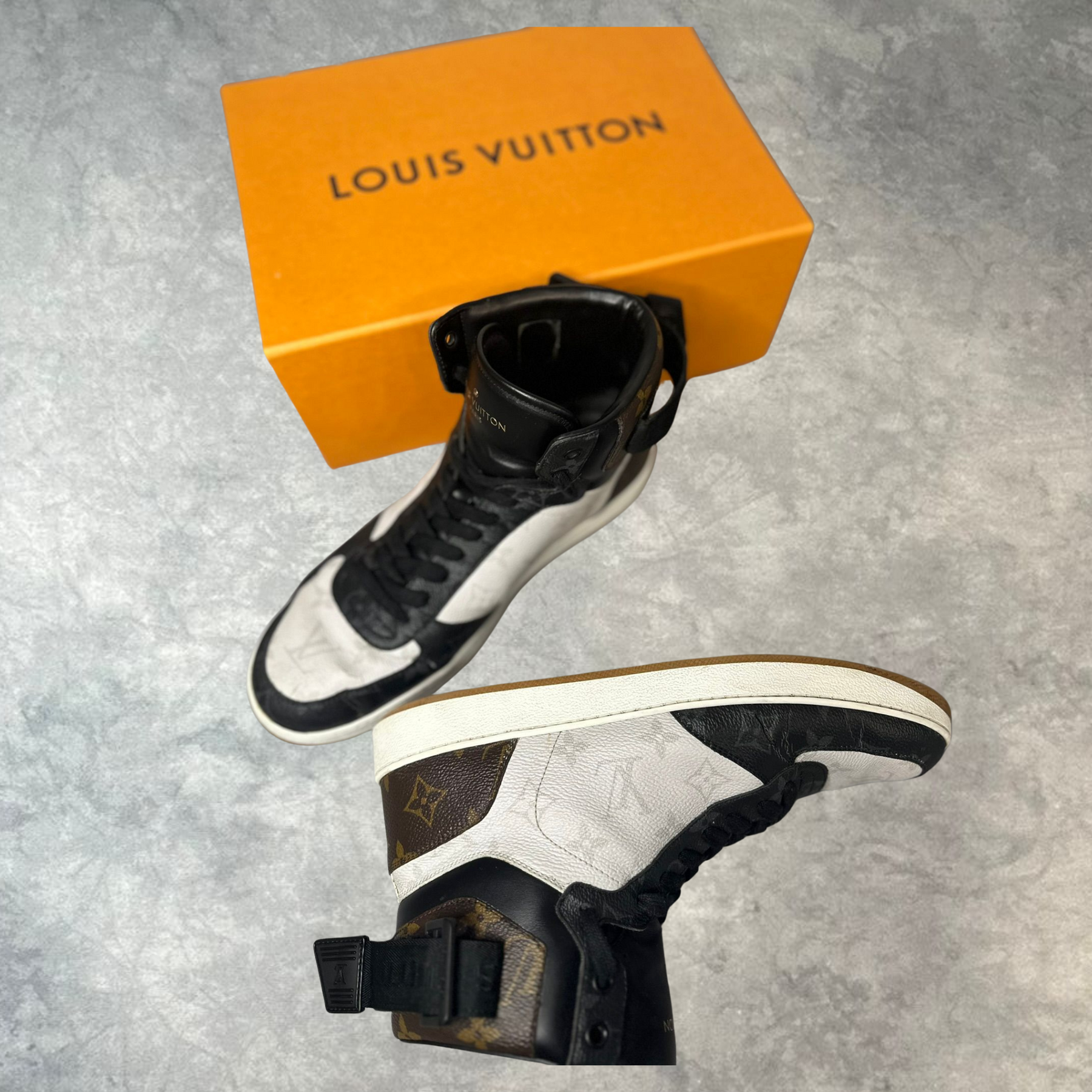 Seltene High-Top Sneaker im ikonischen Schwarz-Weiß-Design mit klassischem Monogramm-Detail. Ein echtes Statement-Piece aus der Welt der Designer-Fashion.